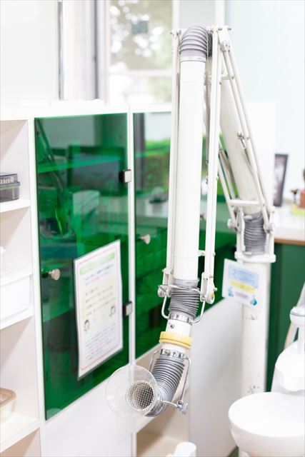 フリーアーム 治療中に出る細かい切削片、水しぶき、粉塵などが大気中に拡がらないように吸引します。これにより院内の空気を汚さずに衛生的な空間で治療を受けていただけます。